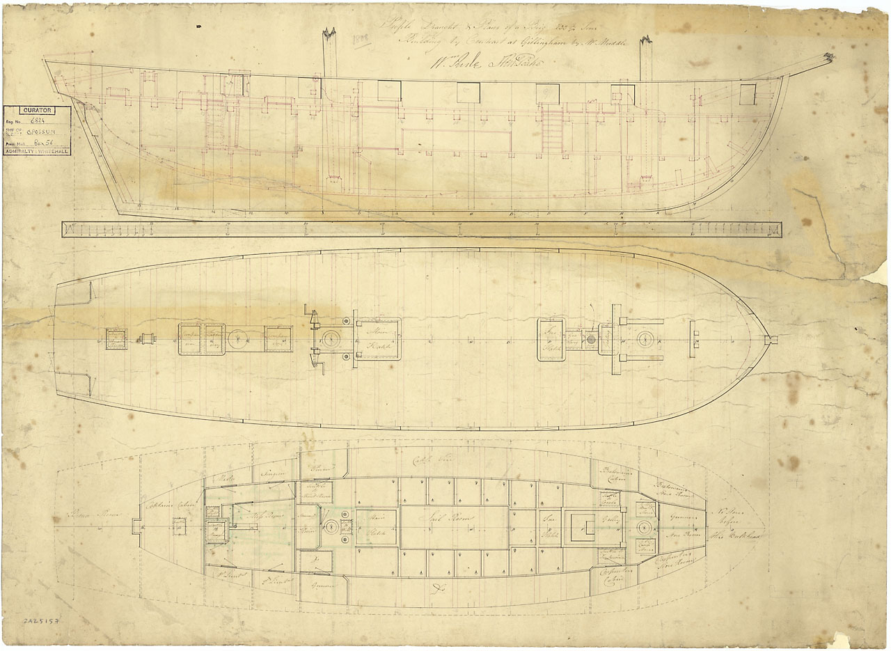 Dauntless (1808); Jalouse (1809); Serpent (cancelled 1810). Scale: 1:48. Plan showing the inboard profile with alterations to the quarterdeck and carronade ports for Dauntless (1808), Jalouse (1808) and Serpent (cancelled 1810).