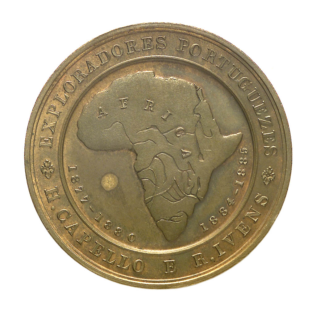 Medal commemorating H. Capello and R. Iveus, Portuguese Explorers. Medal commemorating H. Capello and R. Iveus, Portuguese explorers. Obverse: A map of Africa showing the principal rivers. Legend: 'EXPLORADORES PORTUGUEZES . H. CAPELLO E R. IVENS