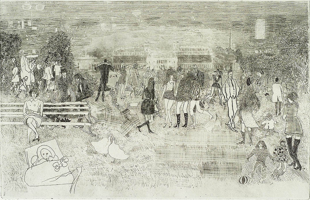 Queen's House, Greenwich (artist's proof). A view down toward the NMM buildings and the Royal Naval College from near the Wolfe statue beside the Royal Observatory. It captures the lively use of the park by visitors and residents of all sorts at