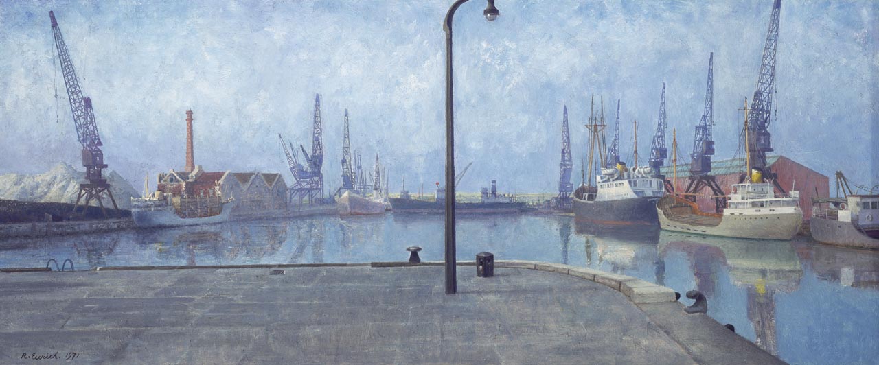 Docks at Goole, Early Morning, 1971. This view of the docks at Goole, on Humberside, is an evocative portrayal of shipping lying alongside the quays. Goole was founded in the 1920s for the export of Yorkshire coal. The warehouses, cranes and dockside furn
