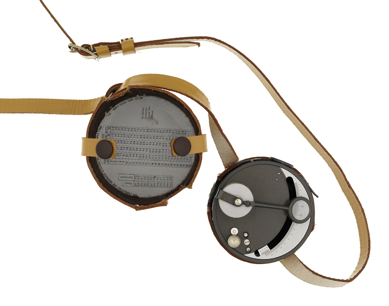 Small Craft Precision Sextant. The extant consists of circular grey-lacquered alloy plates. The lid contains a paper table for correcting the observed altitude of the Sun’s lower limb. The index arm is moved by a milled knob at the pivot point on th
