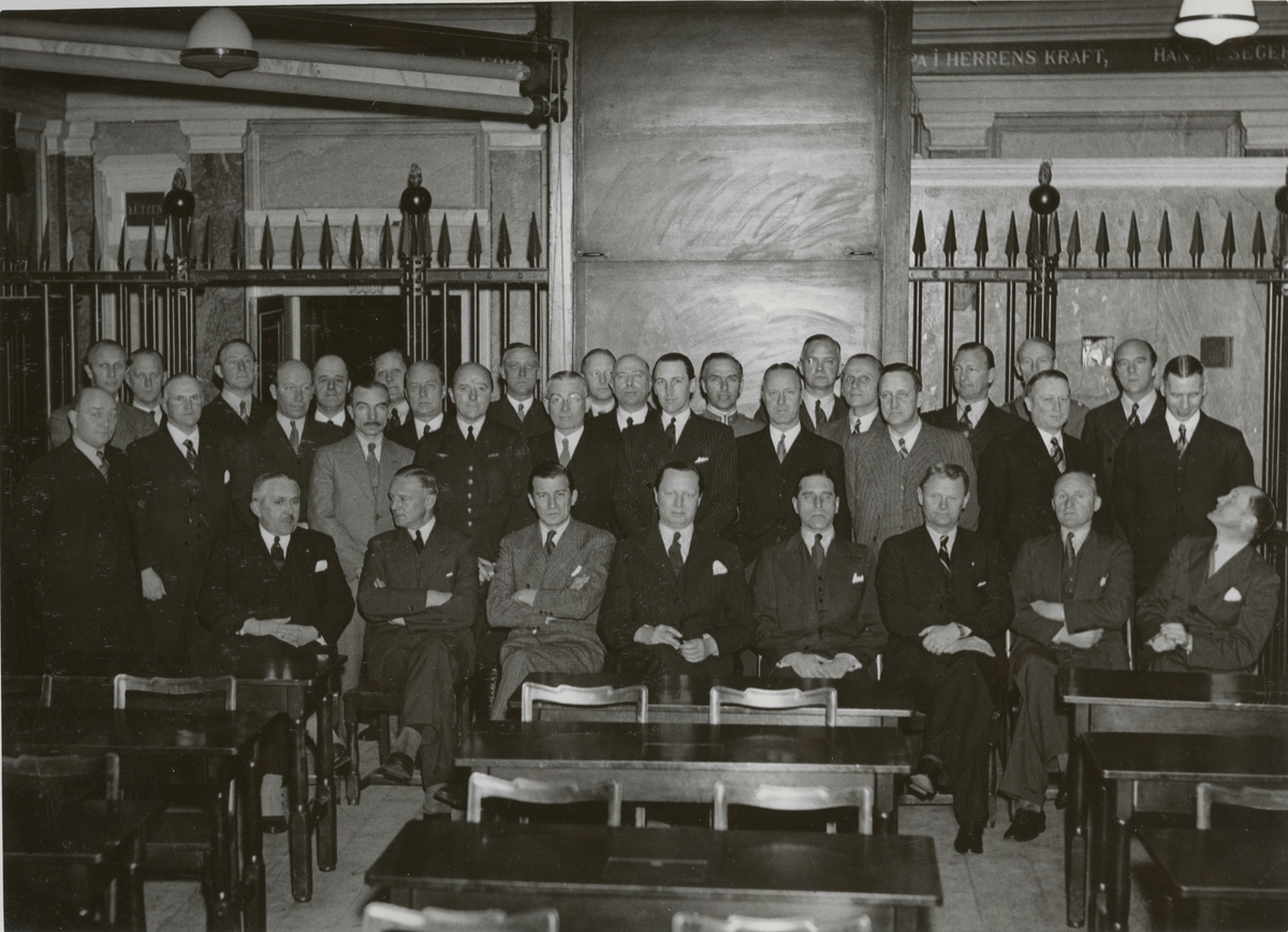 Officerare från 1912-års officerskurs vid Krigsskolan Karlberg samlade till gruppfoto vid firande av 25-års jubileum den 4 december 1937.