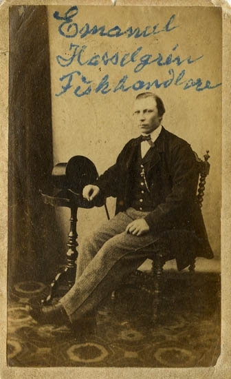 Text på kortets baksida: "Handel.o skeppsredare Emanuel Hasselgren. Född 1804 död 1872".