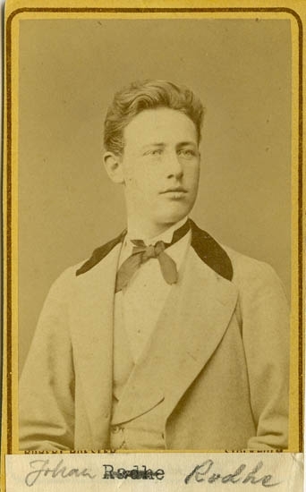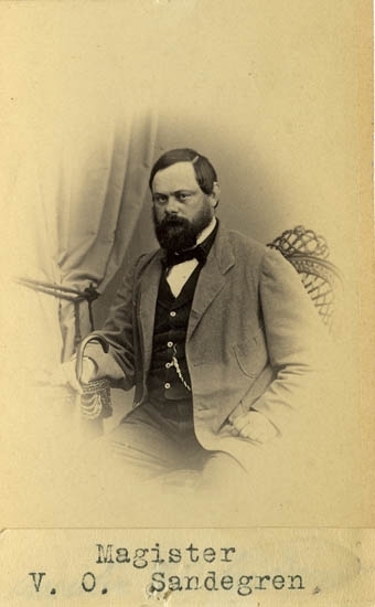 Text på kortets baksida: "Magister Viktor Ossian Sandegren, f. 1823 i Weddige, pastorsson. Magister i Lund 1853. Collega i Strömstad 1857. Do Uddevalla 1859. Läroverksadjunkt i Göteborg 1868. Död 1879 25/4. Gift m. A. S. Lin