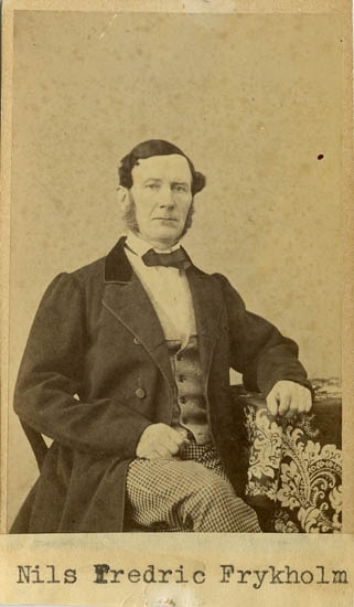 Text på kortets baksida: "Handl. Nils Fredric Frykholm. D. 1856. Bror till Fröken Frykholm".