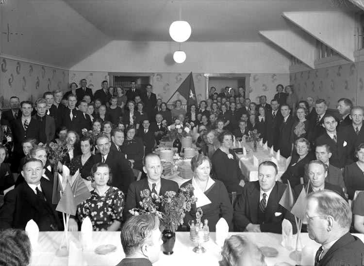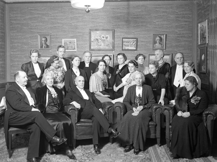Uppgift enligt fotografen: "Uddevalla. Gruppfoto bröllop. Hans Karlsson, Hemmiljö."