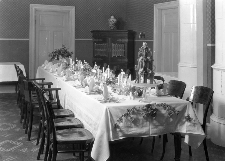 Uppgift enligt fotografen: "Uddevalla. Dukat bröllopsbord. Länsträdgårdsmästaren Vikström, Dingle."