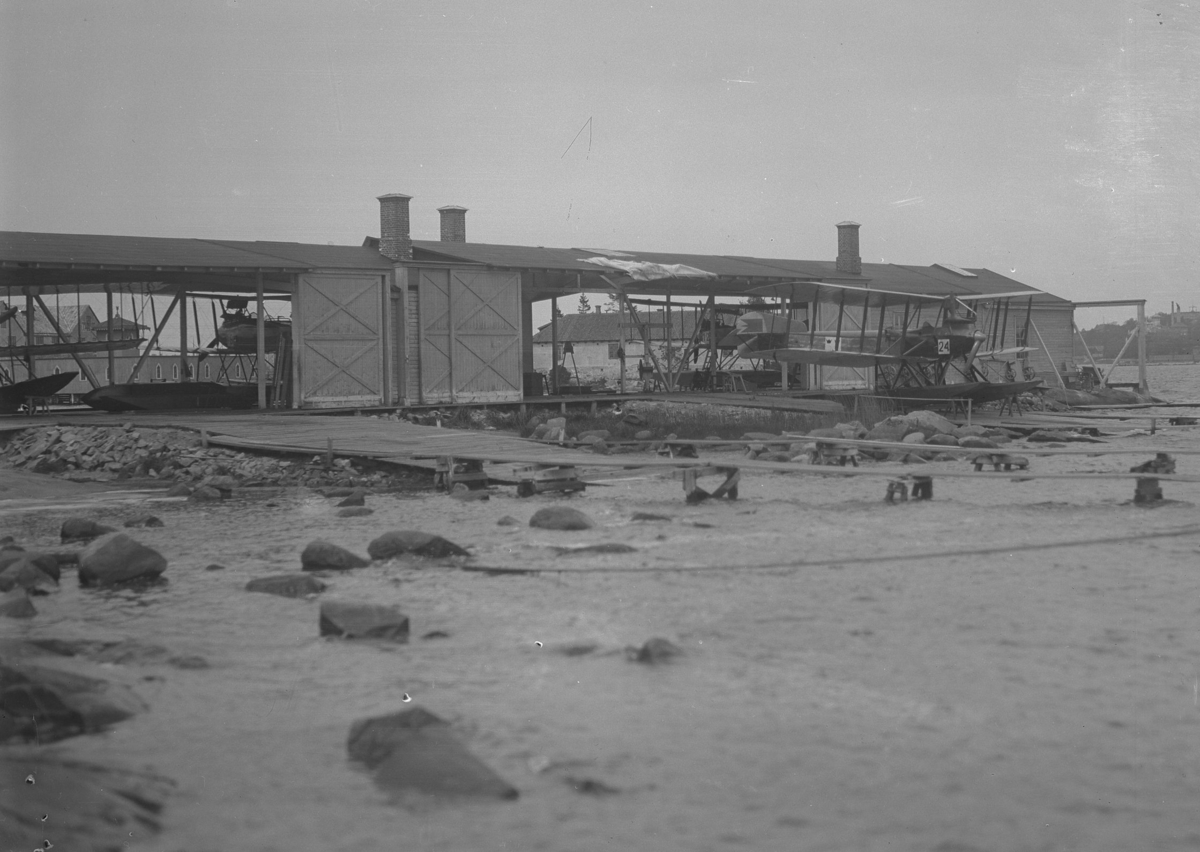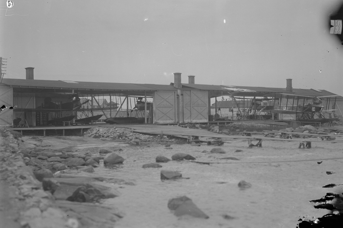 Hangar på Karlskrona flygstation, Stumholmen, 1920. Exteriör bild tagen från vattnet. Flygplan Friedrichshafen FF 49C på plats i hangaren.