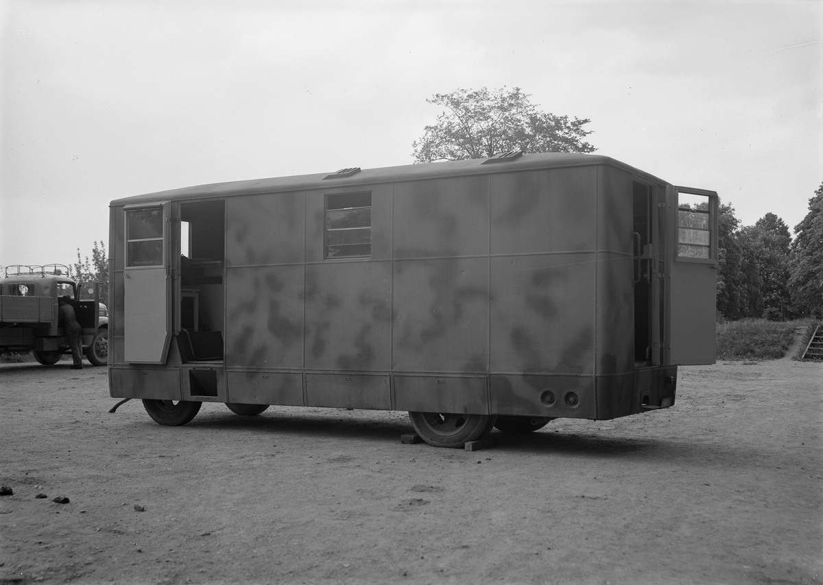 Exteriör av sjukhuset på F 3 Östgöta flygflottilj med manskap uppställd framför. Träd i förgrunden.