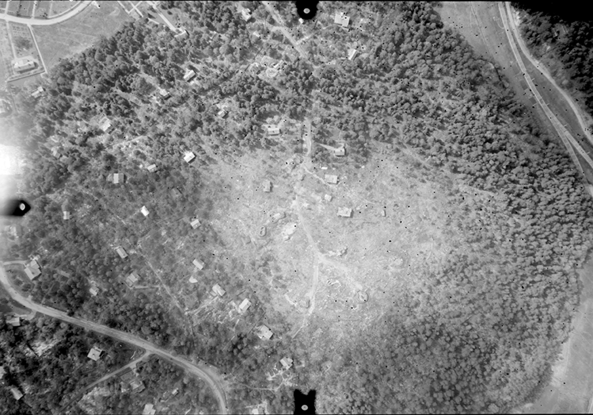 Vattenledningsrör som sprängts under luftskyddsövning på F 2 Roslagens flygflottilj. Personer längs dike i arbete.