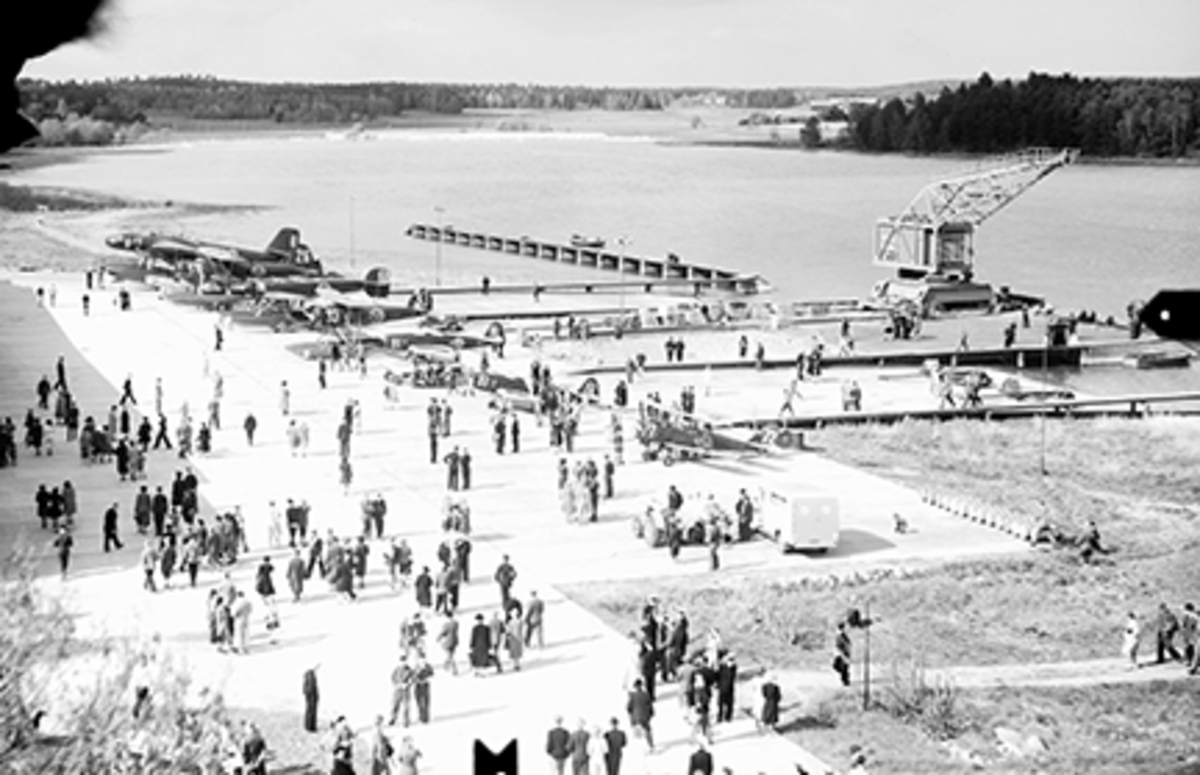 Flygplan, fartyg och människor vid slipen vid flygvapnets dag på F 2 Roslagens flygflottilj, 1942. Flygplan S 9 och T 2.