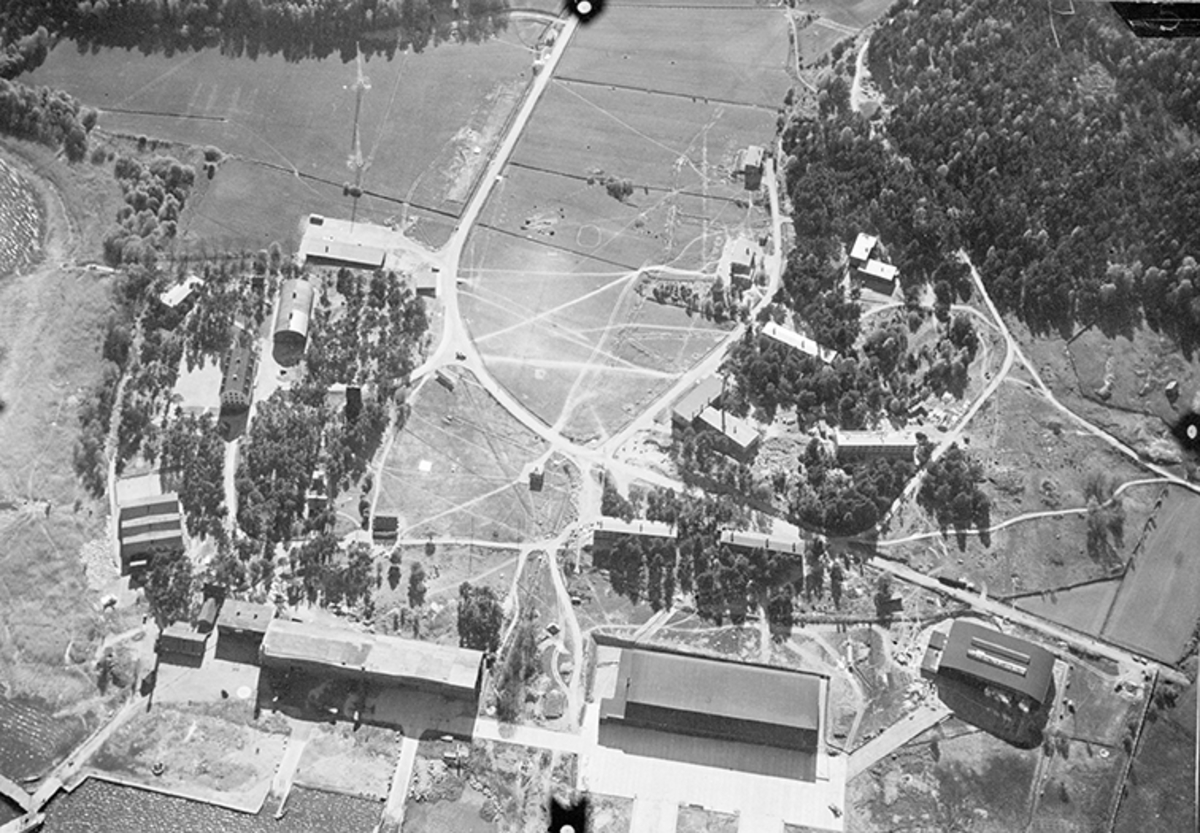 Lysbojar på vattnet vid F 2 Roslagens flygflottilj, 1936. I bakgrunden syns en hangar och slip.