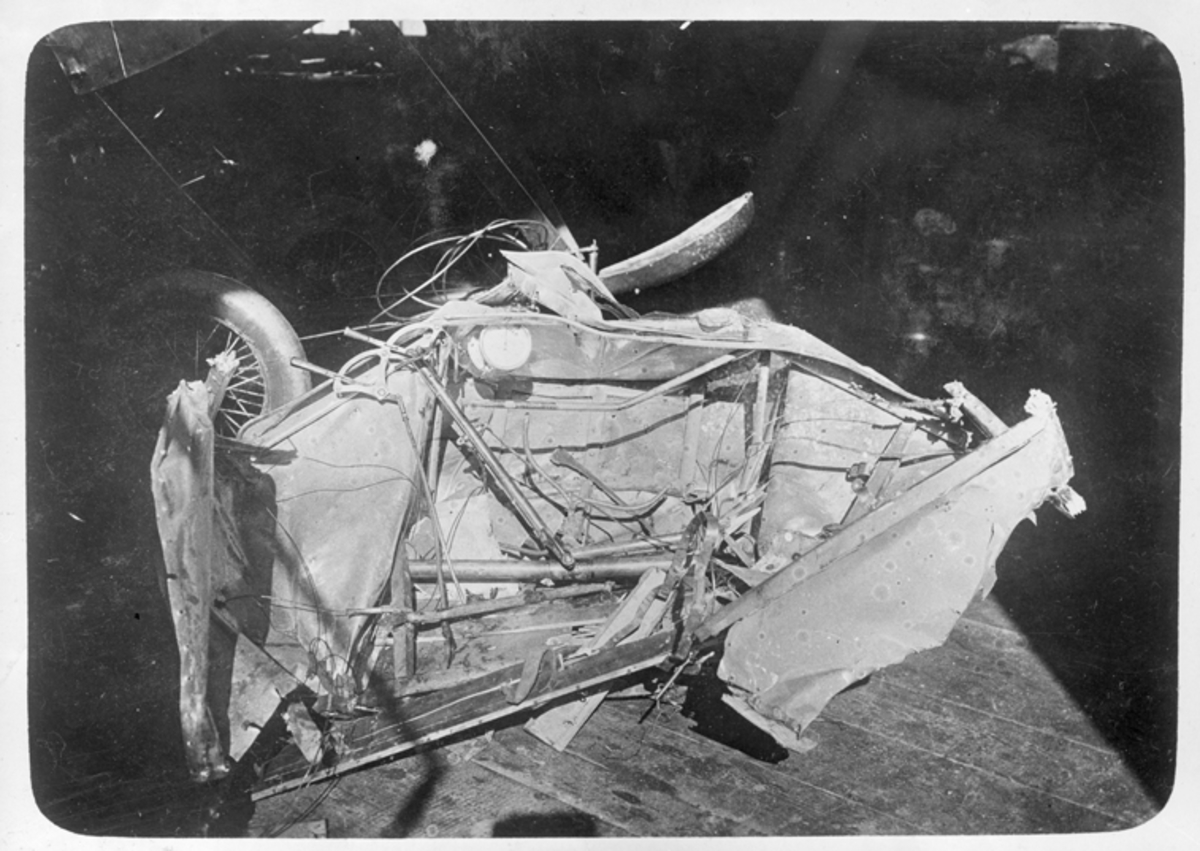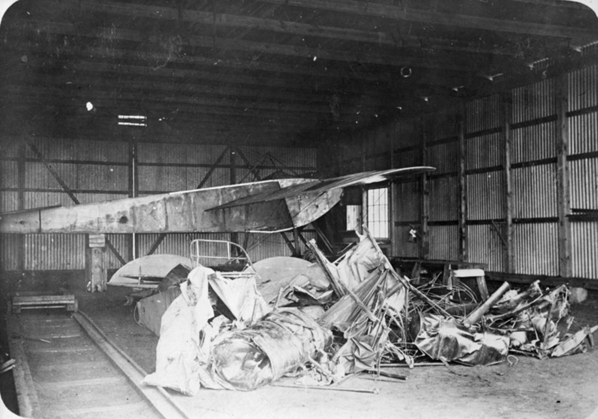 Haveri. Resterna av ett havererat flygplan Farman HF 22 i en hangar på Malmen.