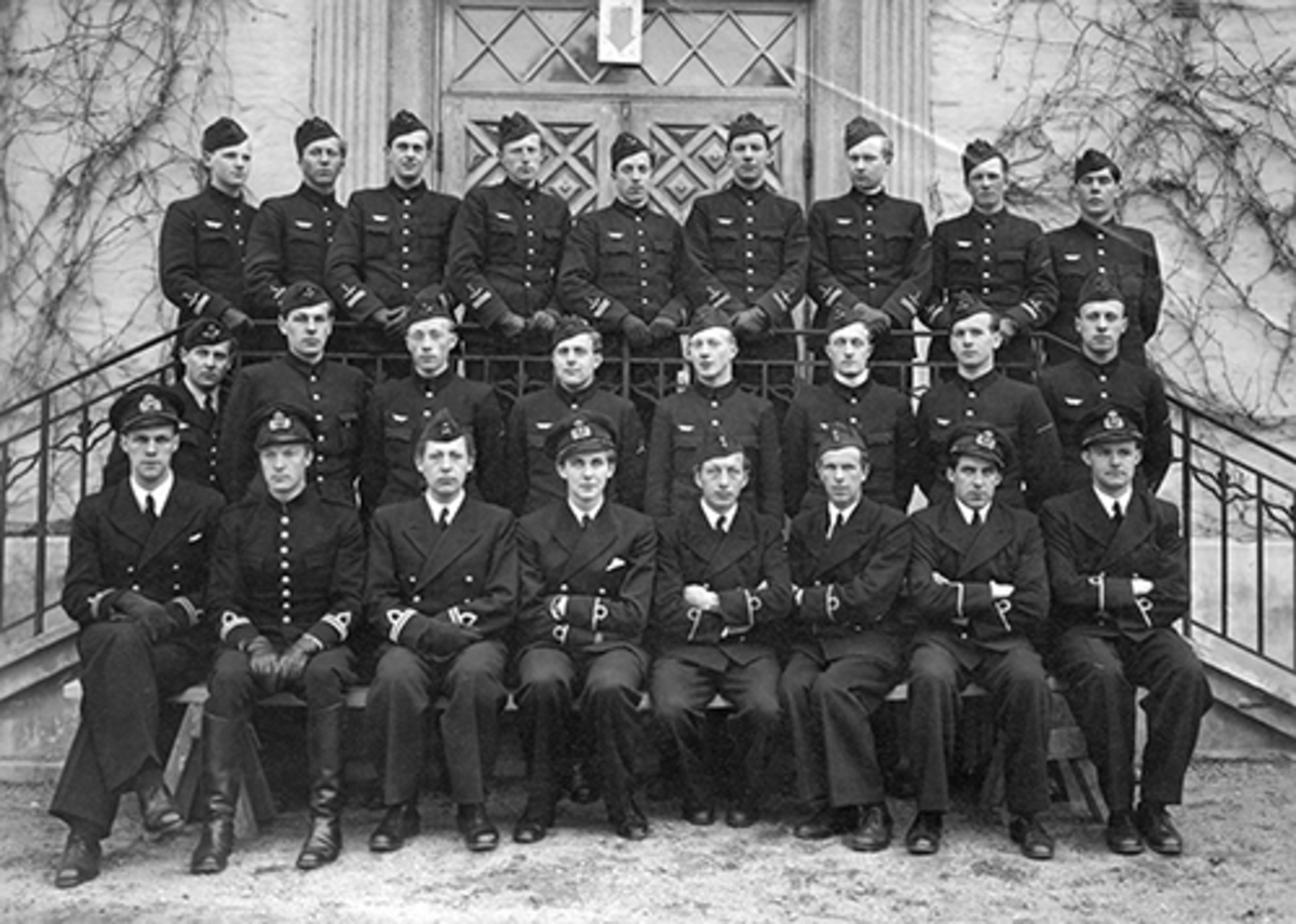 Grupporträtt av elever vid grundläggande flygslagsutbildning, GFSU på F 2, 1944. Framför F 2 kanslibyggnad.