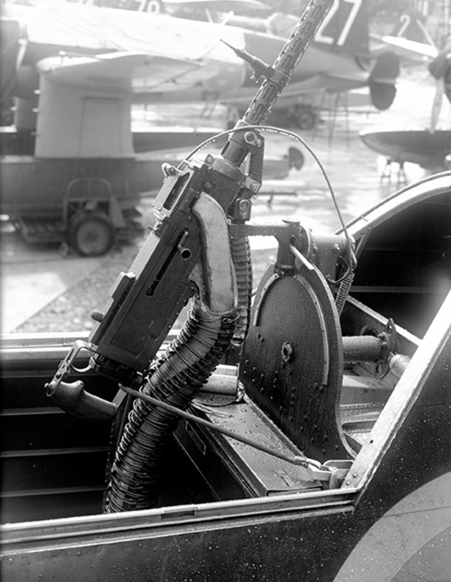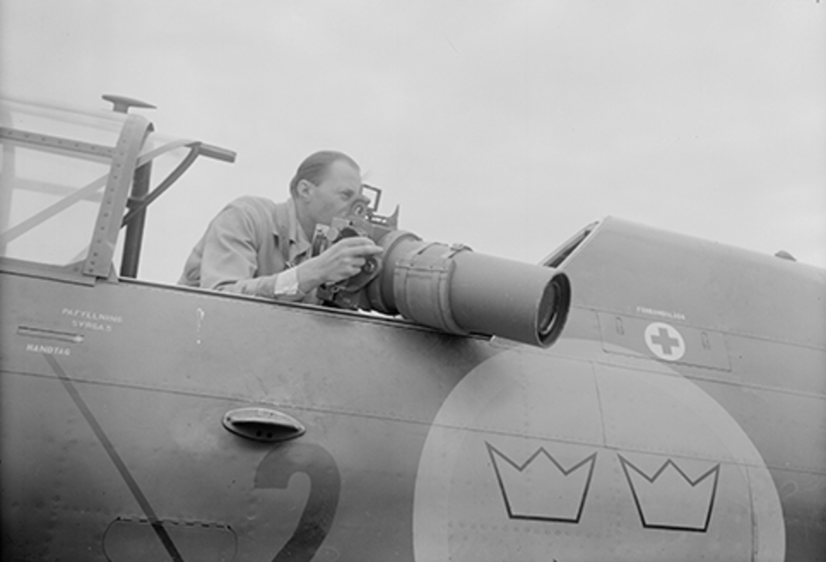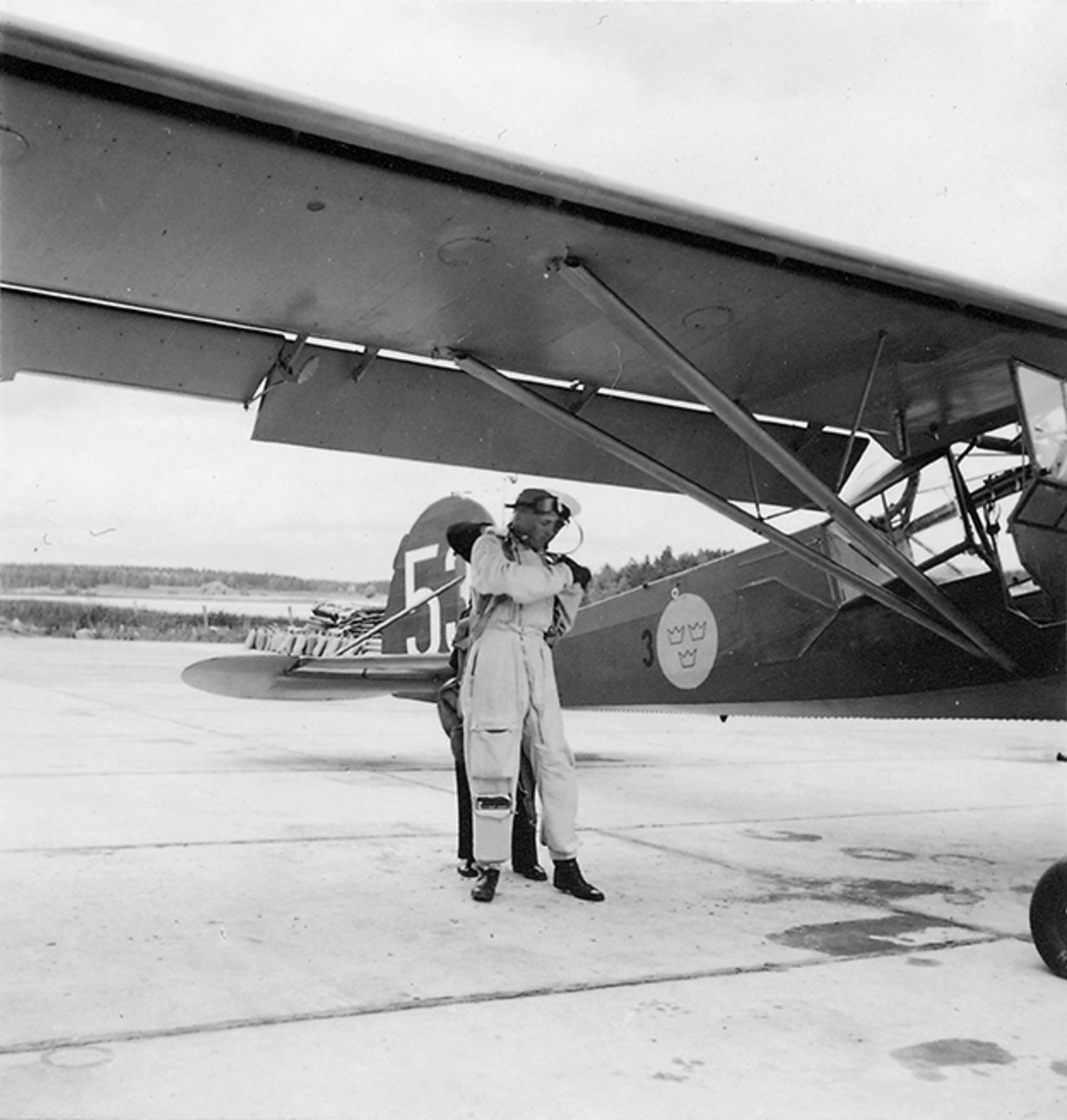 Chefen för flygvapnet, Bengt Nordenskiöld på inspektion av F 2 Roslagens flygflottilj. Nordenskiöld i flygoverall står under flygplansvinge och får hjälp med att sätta på sig fallskärm..