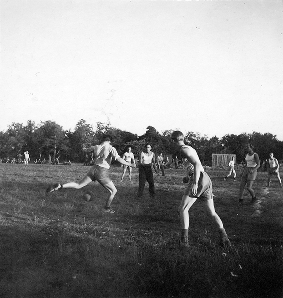 Fotbollsmatch vid idrottstävling mellan F 2 Roslagens flygflottilj och F 3 Östgöta flygflottilj på Fårösund, 1942.