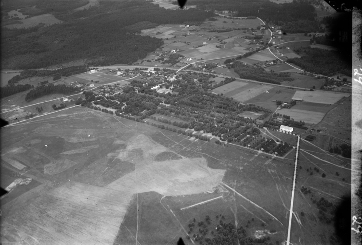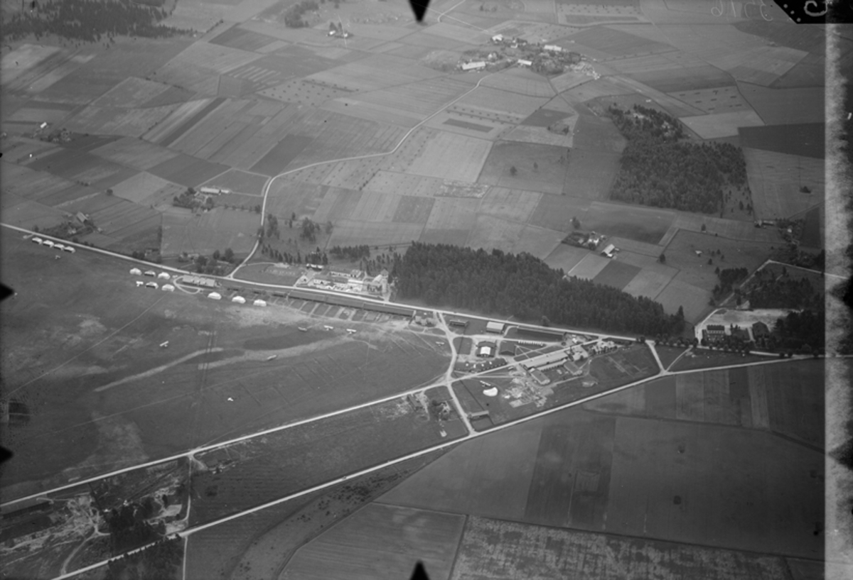 Flygfotografi av Rinkaby flygstation, 1924. Fotograferat från 900 meters höjd. Byggnader, tälthangarer och flygplan.