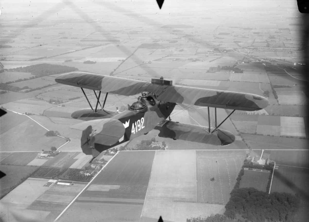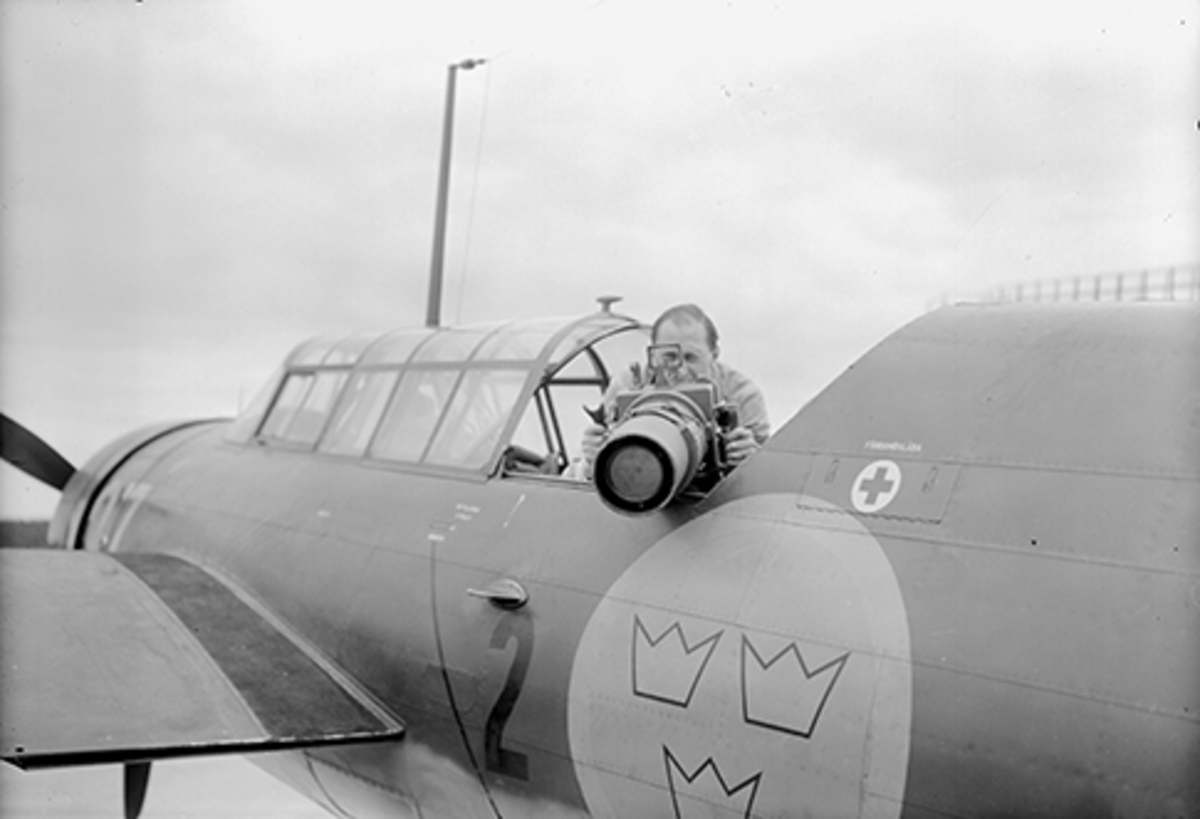 Civilregistrerat flygplan FVM S 18 S-ALAA står på ett flygfält på Malmen. Inramat foto.