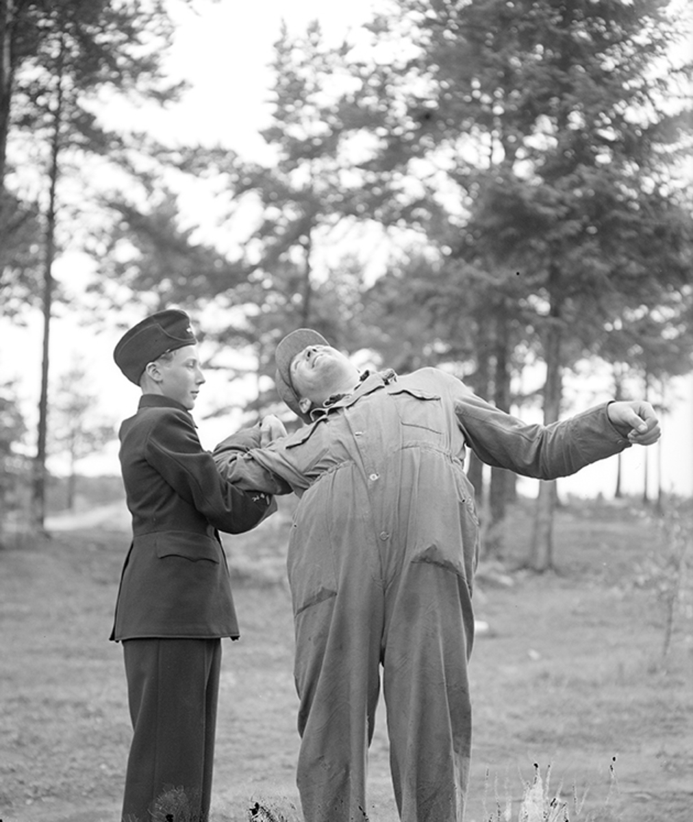 Förevisning av kampsport på F 2 Roslagens flygflottilj, 1940. Flygvapenungdom förevisar bakåtvridning av arm, utomhus.