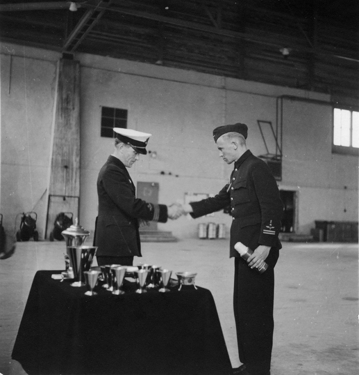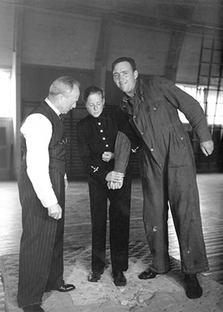 Förevisning av kampsport på F 2 Roslagens flygflottilj, 1940. Flygvapenungdom kopplar grepp om mekanikers arm under inspektion av äldre män, inomhus