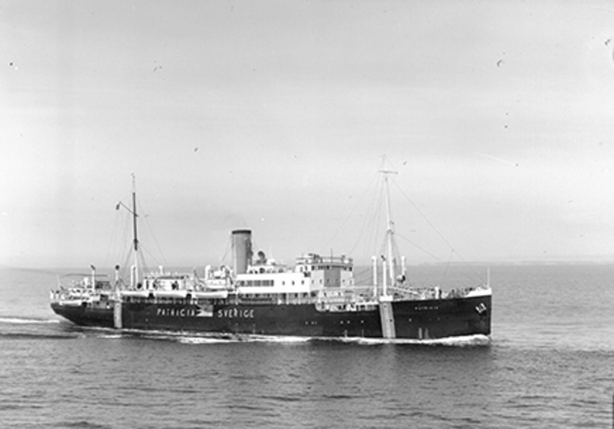 Flygbild av 1:a torpedbåtsflottiljen till sjöss, 1922. Sju stycken mindre fartyg och två stycken större.