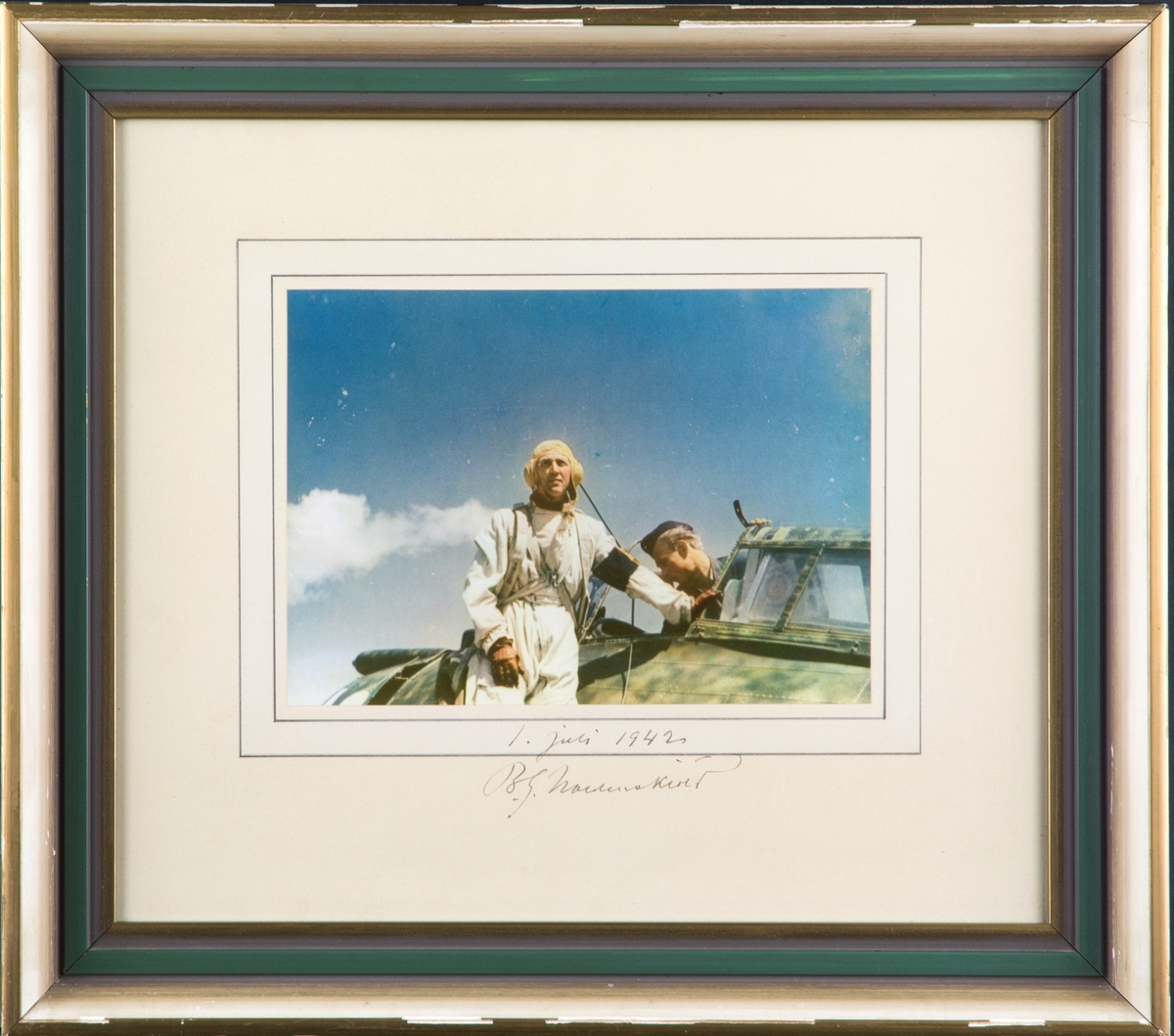 Kolorerat porträttfotografi av Bengt Nordenskiöld, chef för Flygvapnet 1942-1954, i flygarutrustning vid flygplan. En flygmekaniker jobbar i bakgrunden. Signerat, inramat foto.