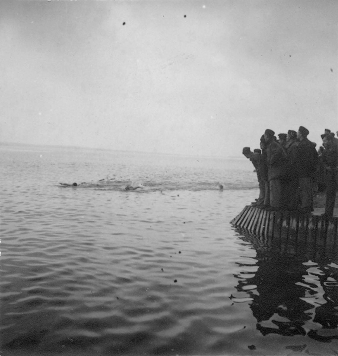 Simning vid idrottstävling mellan F 2 Roslagens flygflottilj och F 3 Östgöta flygflottilj på Fårösund, 1942.
