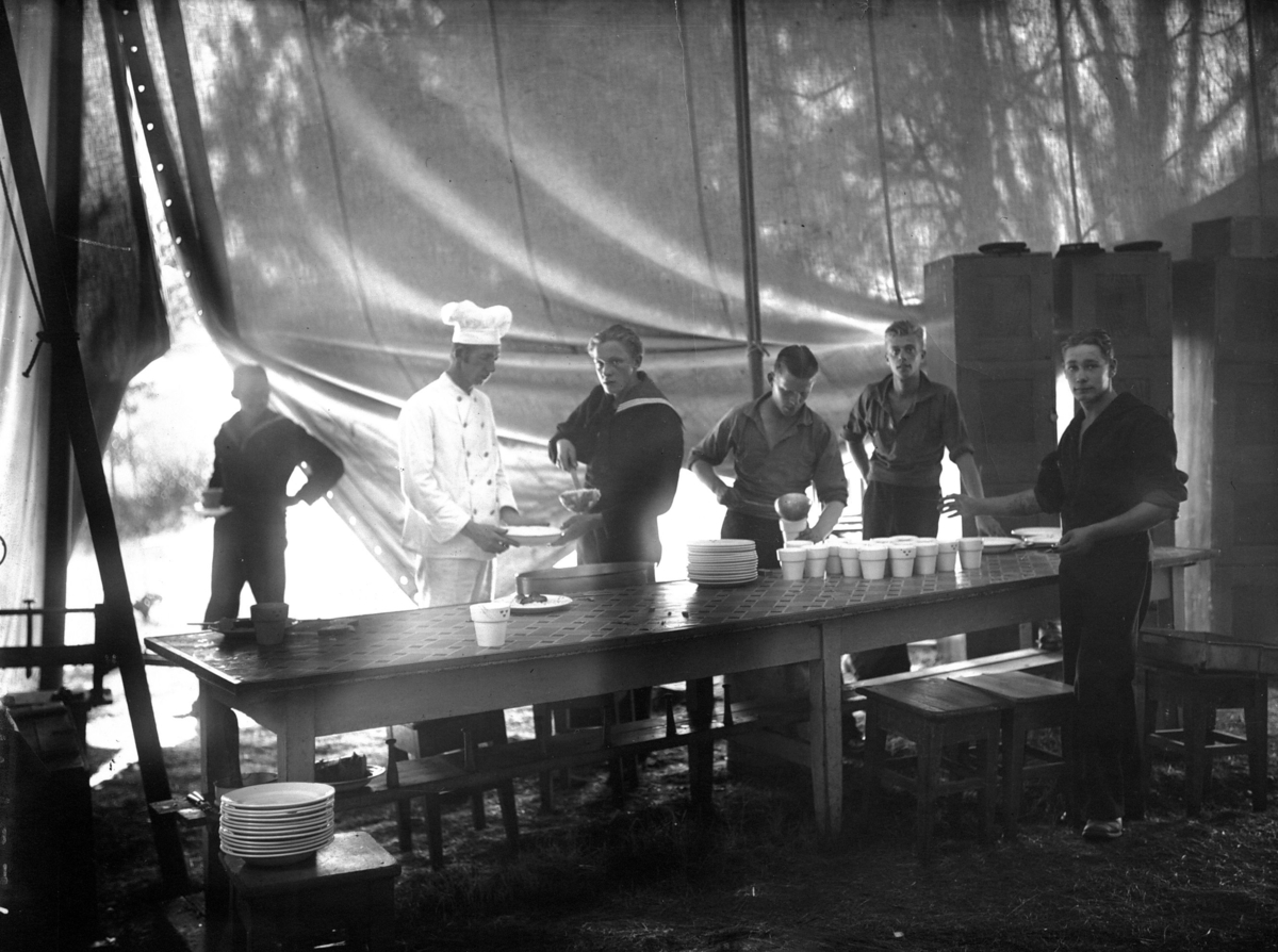 Personal ur marinen intar måltid i ett tält på F 2 Roslagens flygflottilj, 1934.
