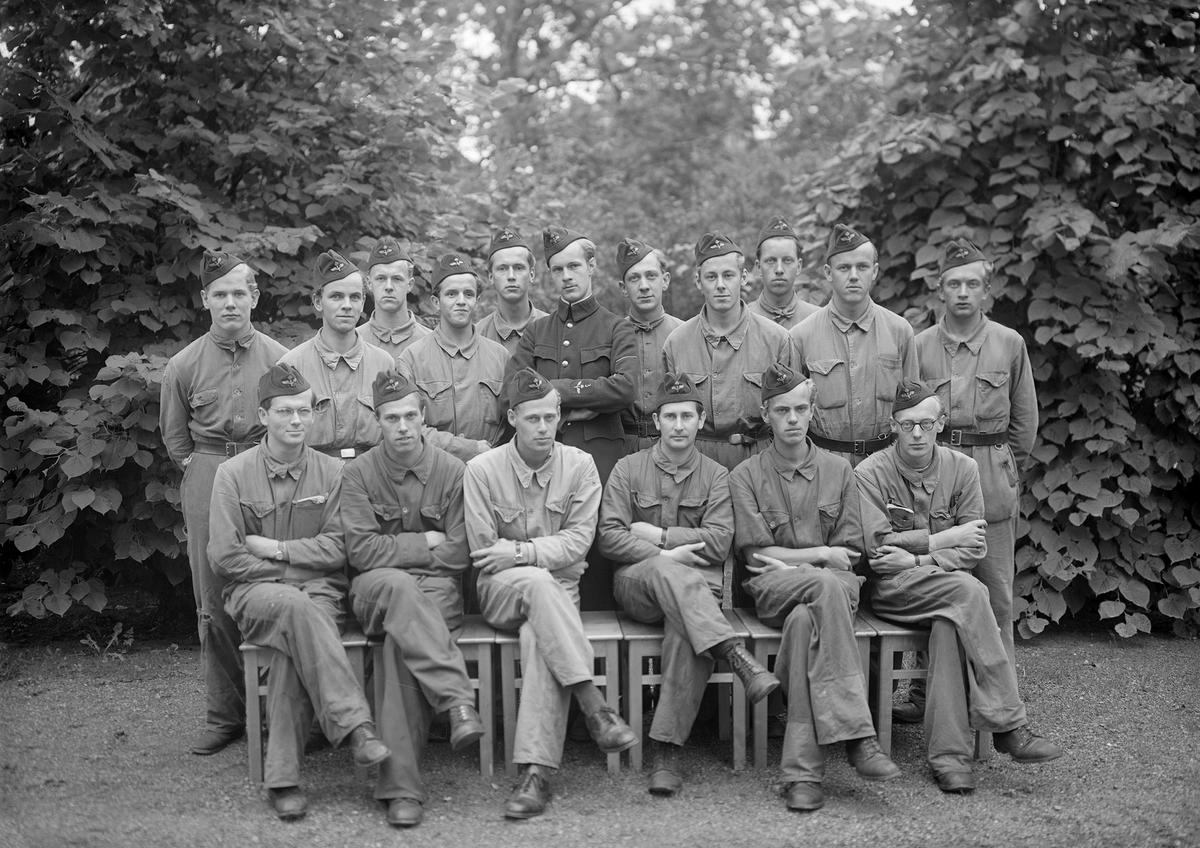 Biträdande ingenjörer på F 3 Östgöta flygflottilj, 1943. Grupporträtt utomhus, 2 bilder.