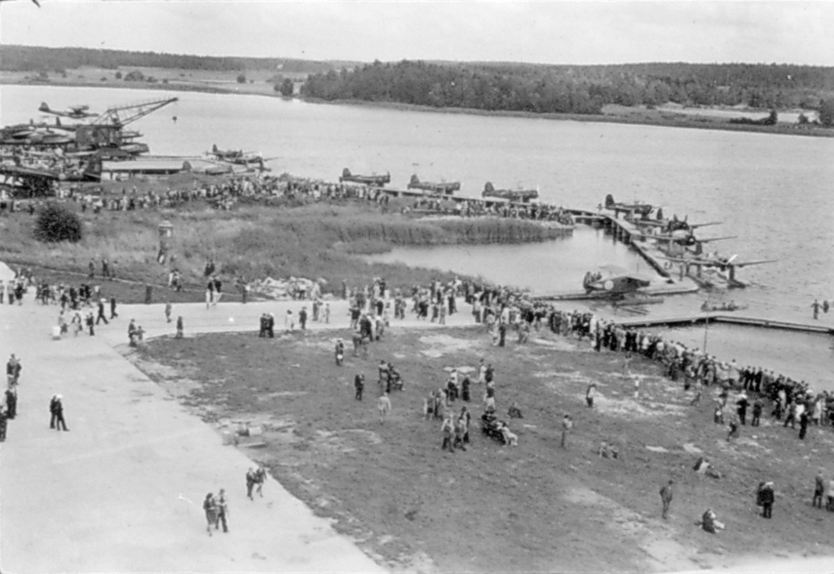 Chefen för F 2 Roslagens flygflottilj, Herman Sundin, inspekterar marinspaningskursen på Fårösund, 1938. Manskapet lediga och återgår till arbetet.