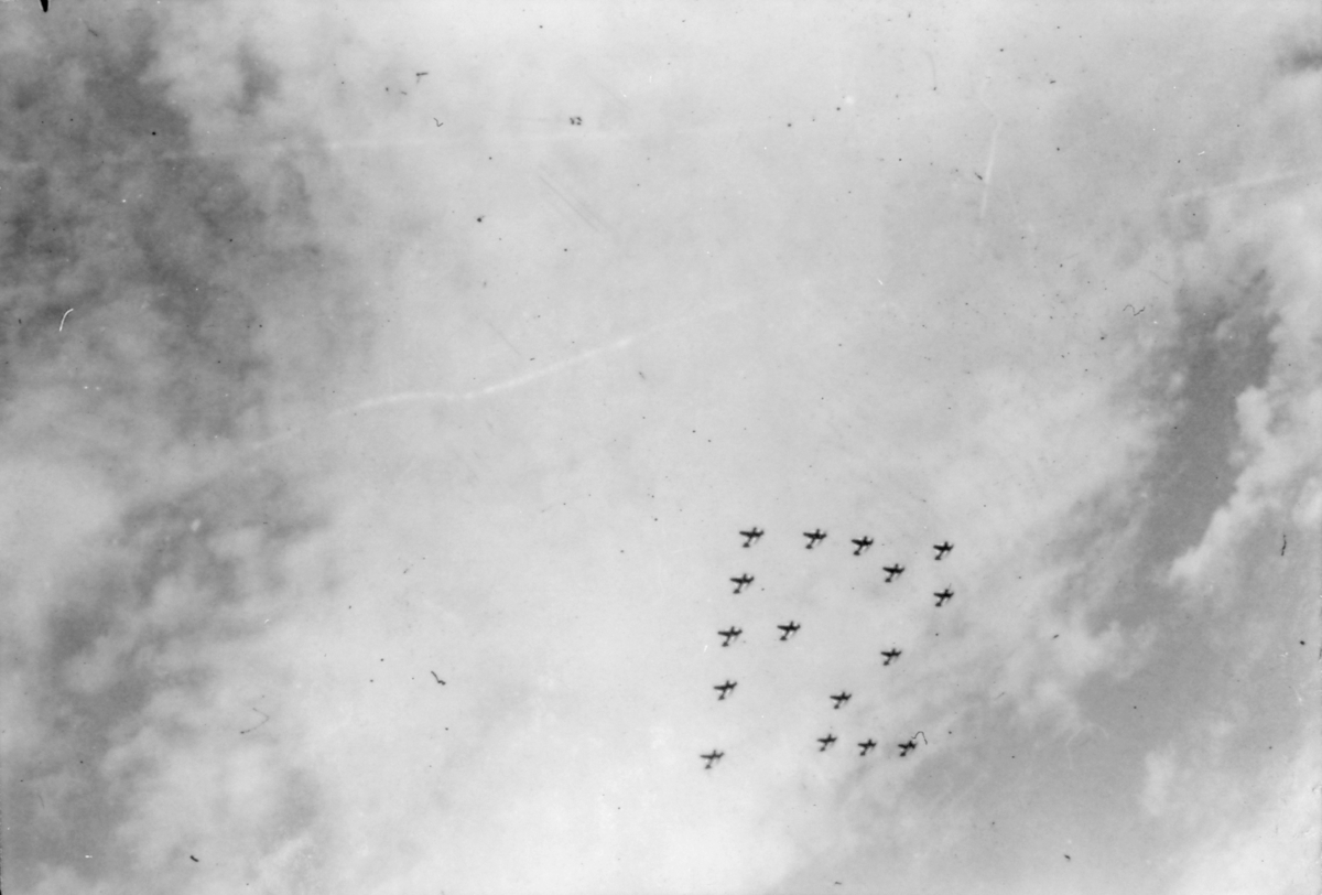 Fem flygplan flyger i formation över Rinkaby flygstation. På marken syns tälthangarer.