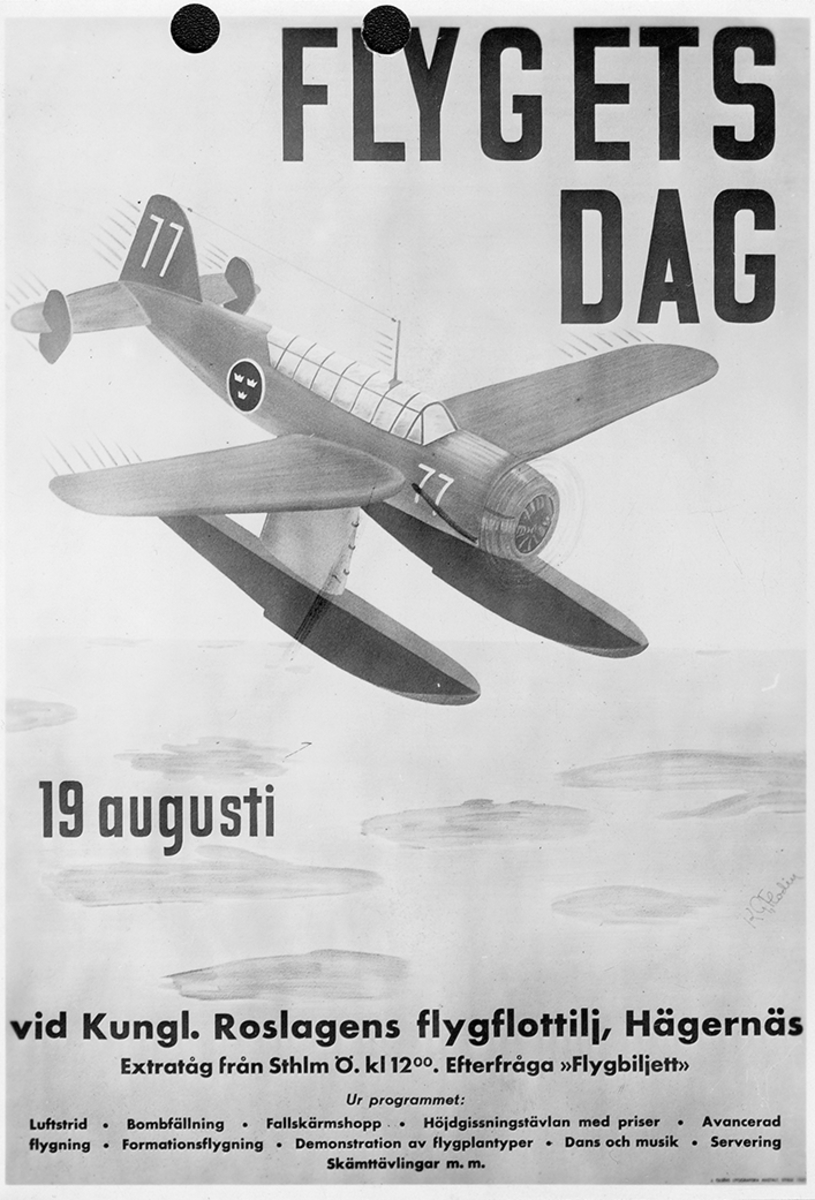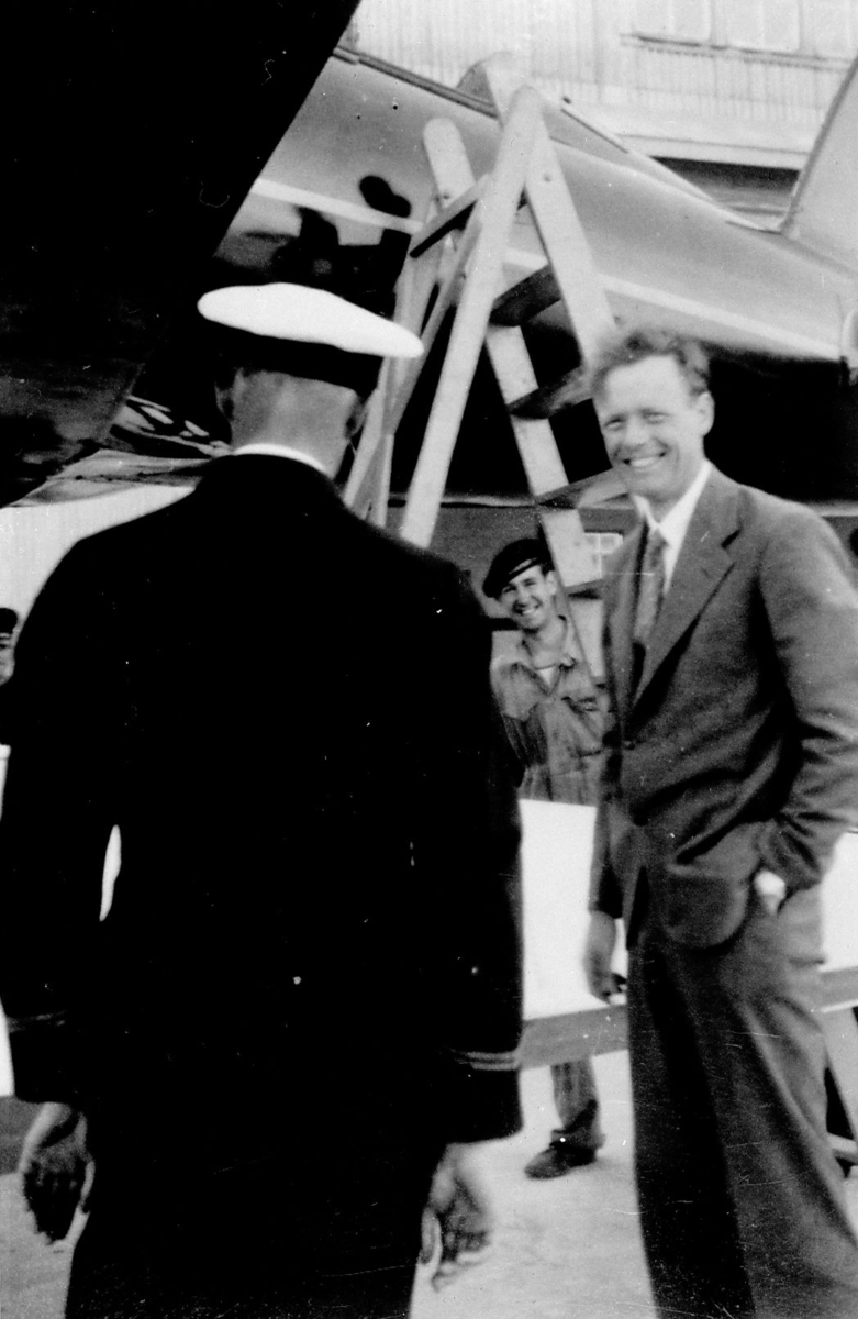 Charles Lindbergh på besök på F 2 Roslagens flygflottilj, 1933. Lindbergh står vid ett sjöflygplan tillsammans med en svensk officer.