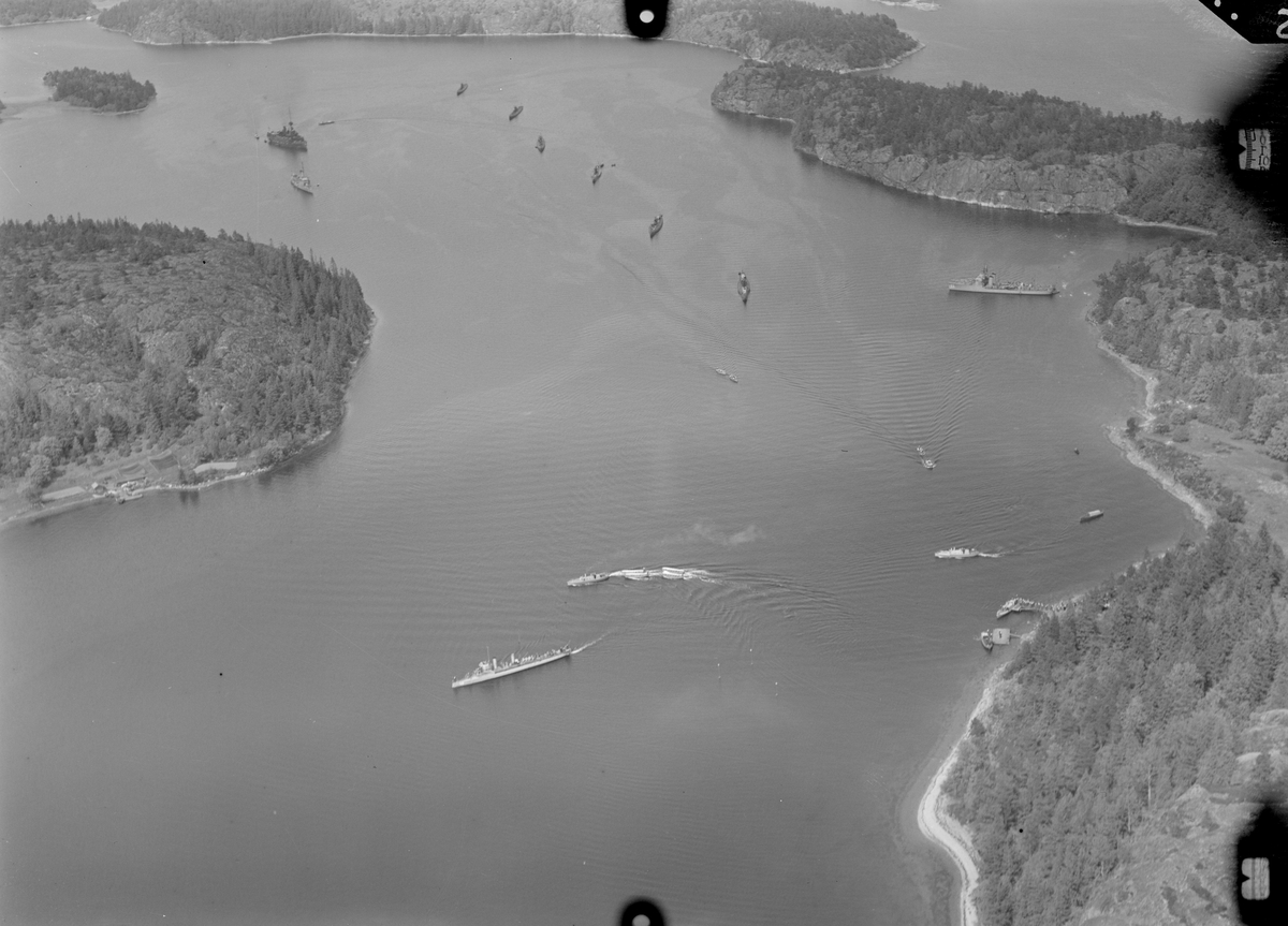 Charles Lindbergh och Anne Morrow Lindbergh flyger in för landning i sjöflygplanet Lockheed 8 Sirius vid besök på F 2. I förgrunden väntar tre militärer på en brygga.
