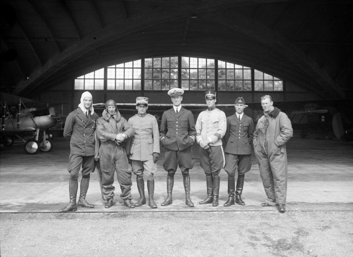 Grupporträtt av sju män framför en hangar. Tre flygplan syns i bakgrunden.