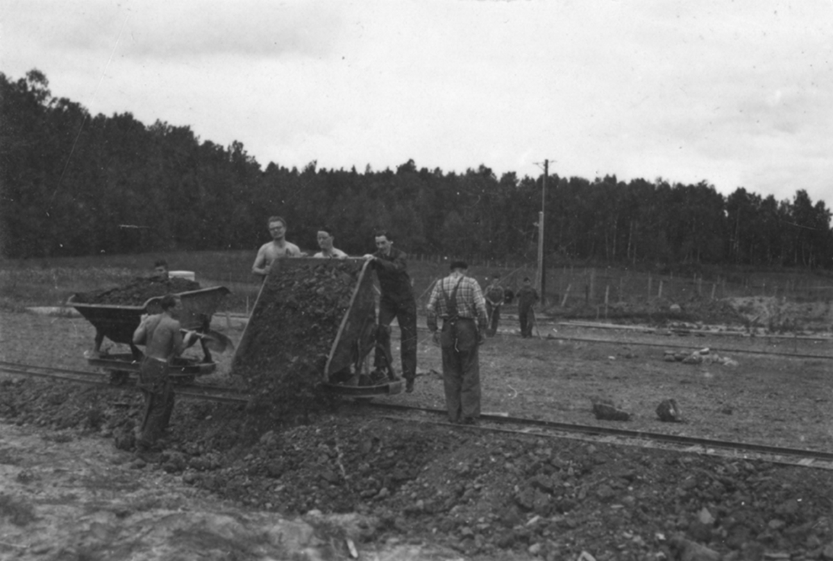 Idrottsplatsen på F 2 Roslagens flygflottilj byggs, 1943. Civilanställda tjänstemän i arbete med grävning.