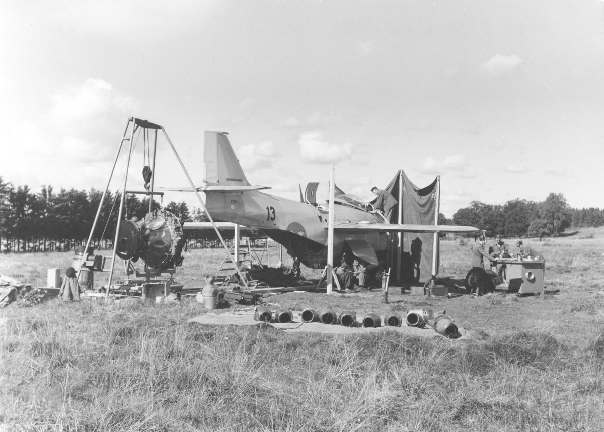 Fältverkstad på F 13, 1952. Mekaniker i arbete med flygplan 29 Tunnan.