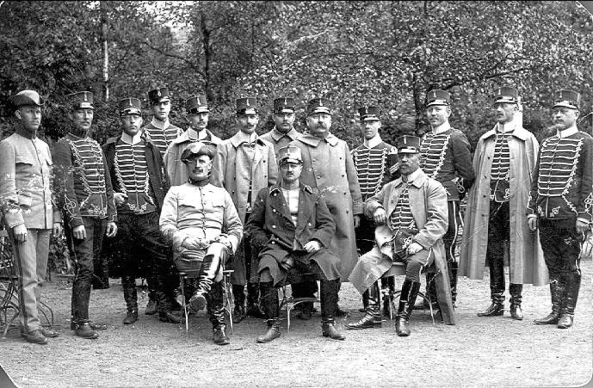 Befäl vid exercisskvadronen 1881 i Örebro. Från vänster: Underlöjtn Gustaf Örn, underlöjtn Stafs von Post, löjtn Göran Posse, underlöjtn Wilhelm von Essen, löjtn Carl Axel Lewenhaupt, underlöjtn