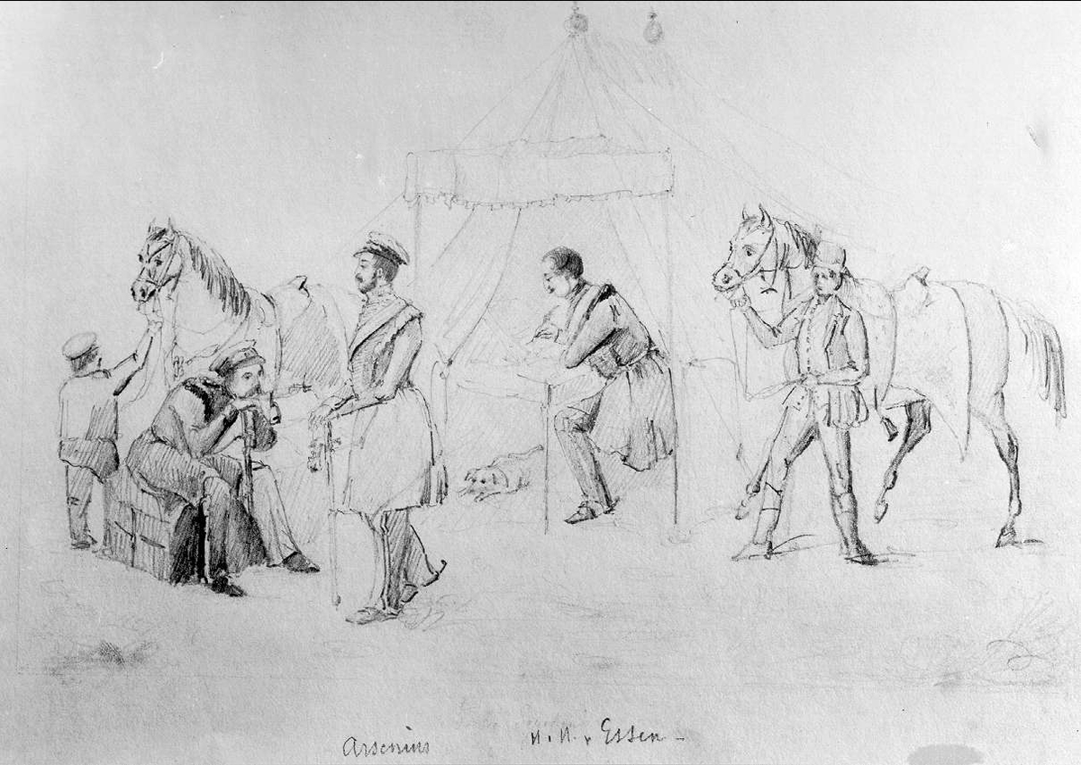 John Arsenius, född 1818. Officer vid K 3 1838-1868. Känd konstnär, framför allt hästmålningar. Söner: Georg -- Konstnär. Sam -- Officer, fältjägare. Scen vid Remonteringen den 27 Januari 1845