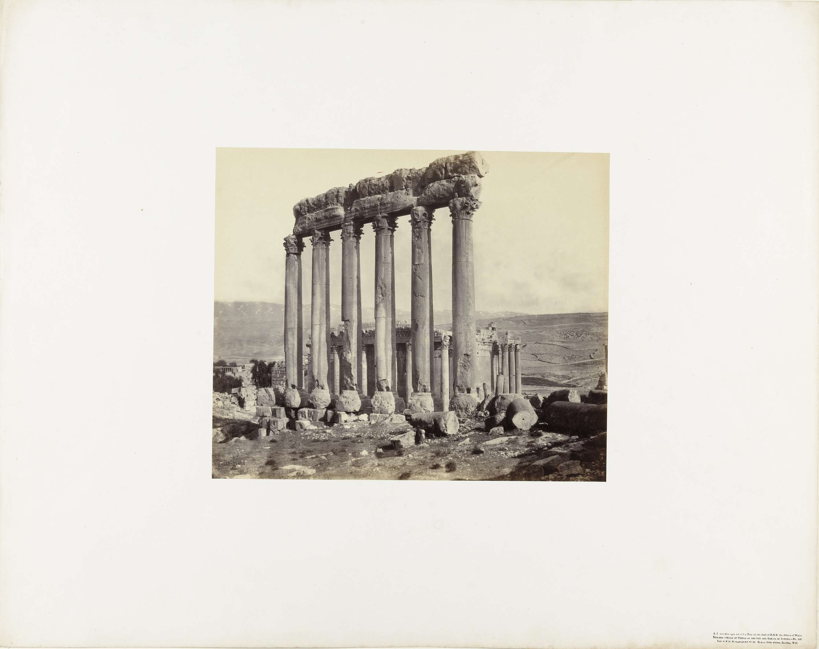 Zuilen van de Tempel van Jupiter en de tempel van Bacchus op de achtergrond te Baalbek