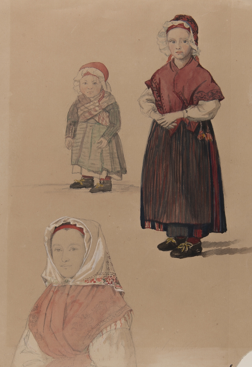 Folkdräkter (i allmänhet). Färglagd teckning av Fritz von Dardel (1817-1901). "Studie av allmoge, delvis från Dalarna".