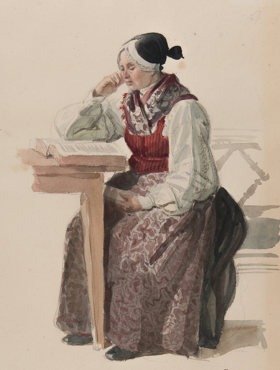 Kvinna i kyrkdräkt, Ljusdahl 1840. Akvarell av J.W Wallander. Kvinna i helfigur, sittande vid ett bord med en bok .