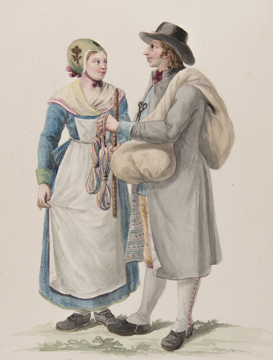 Dräkt. "habitant de la Westergothie" En knalle och en kvinna. Akvarell i storformat av C.W Swedman