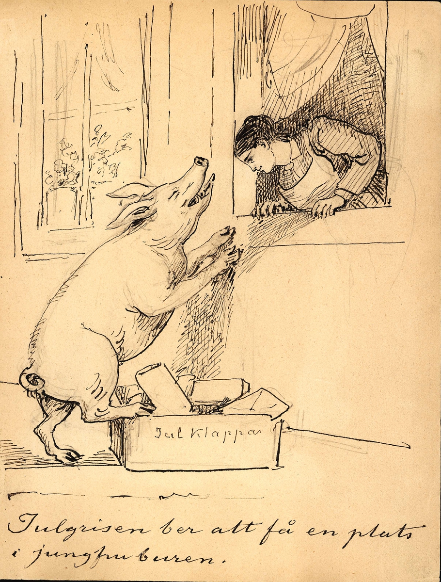 Teckning av Fritz von Dardel. En kvinna lutar sig ut genom ett fönster och betraktar en gris som vill komma in. "Julgrisen ber att få en plats i jungfruburen."