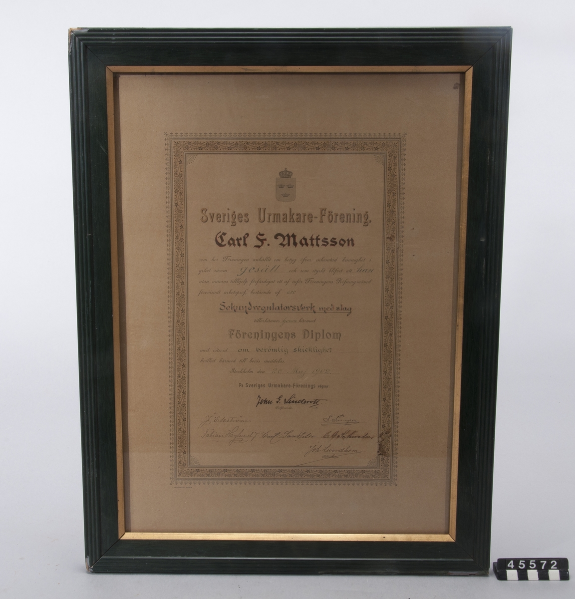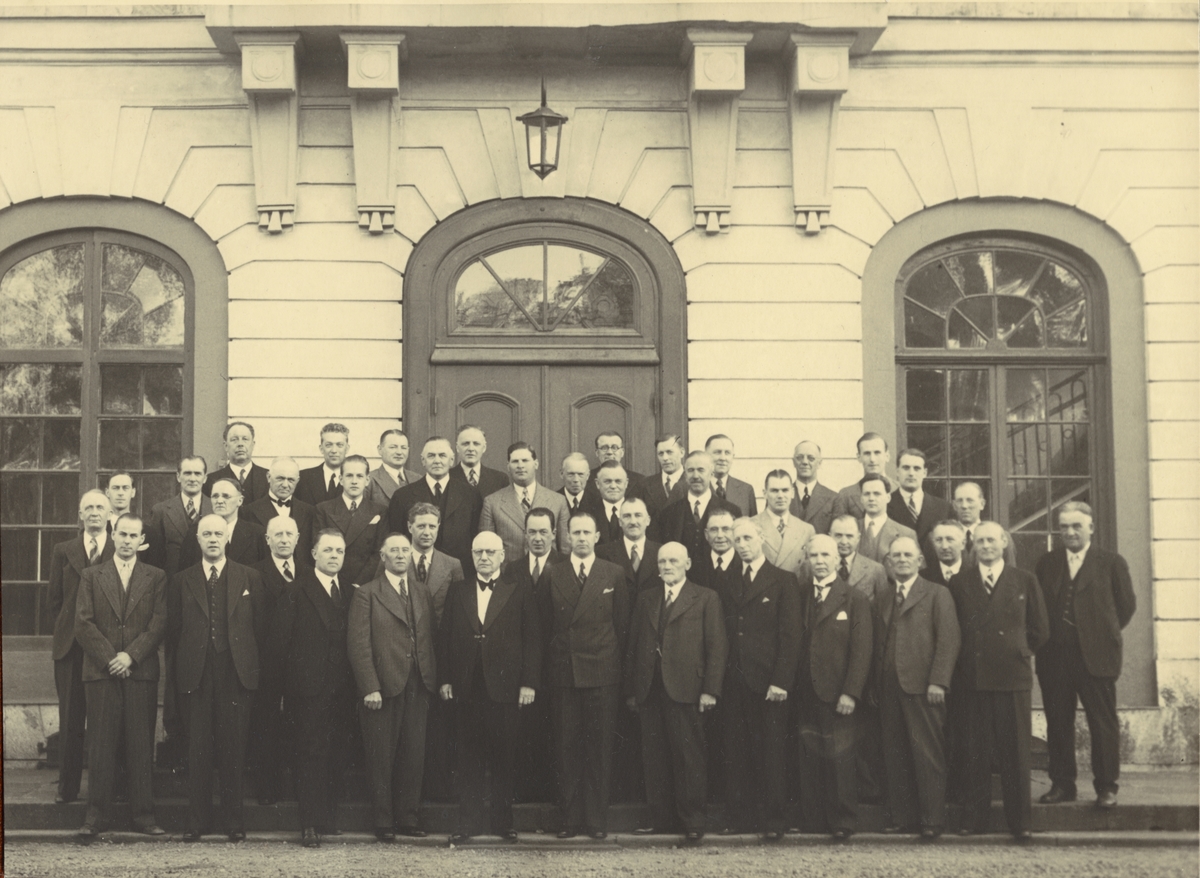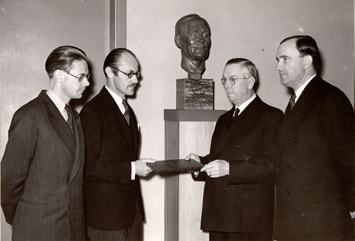 Tekniska museet, 30 maj 1942. Från höger: Direktör Arne Hjort, Generalkonsult Hugo Duhs, Intendent Torsten Althin och Ingenjör Sven Sköldberg vid överlämnandet från B.A. Hjort & Co av Frans Wilhelm Lindqvists