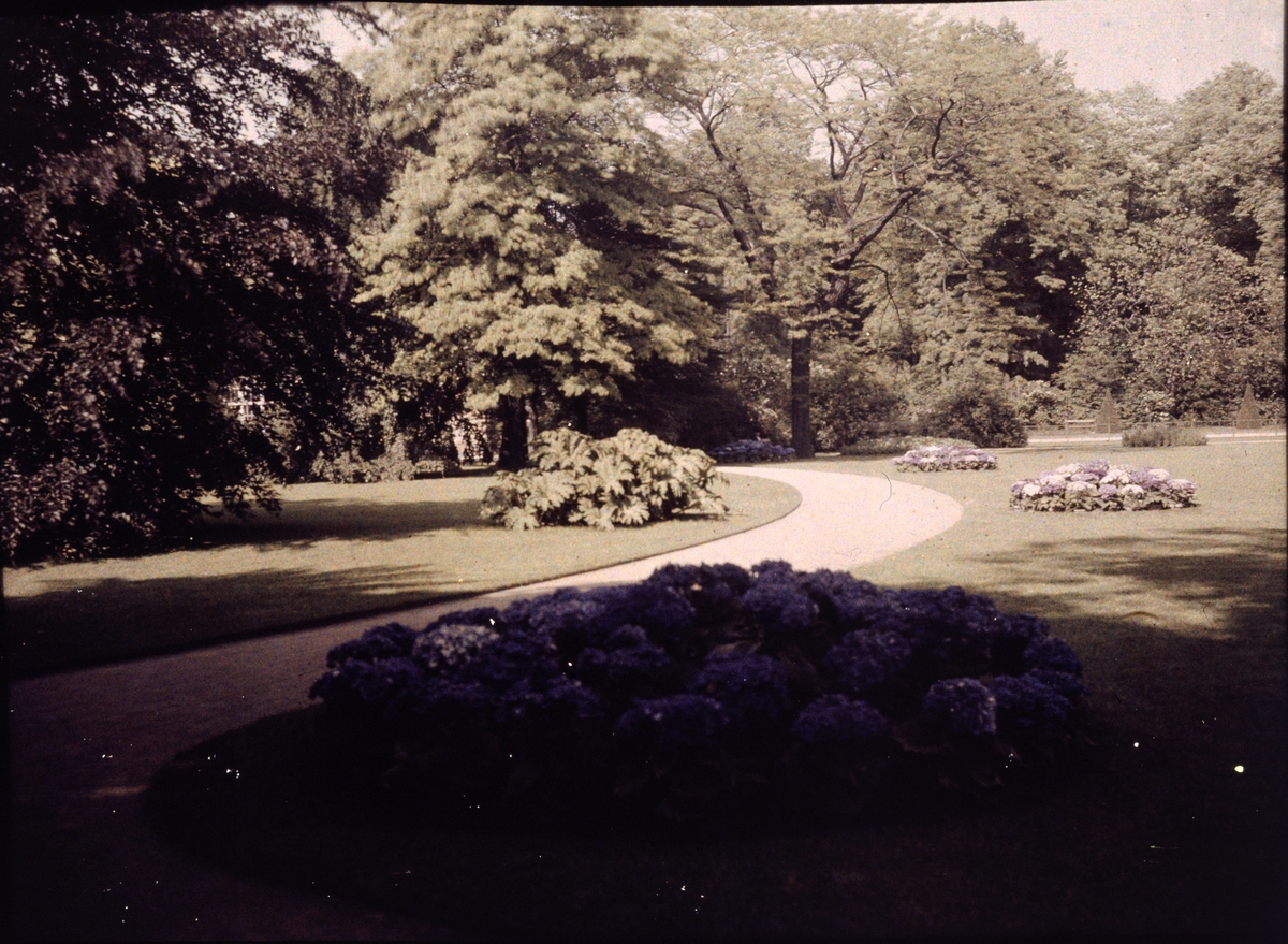 Lumières-autokrom. Stor trädgårdsodling av rododendron i Dresden. Fotograferad den 31 maj 1910 kl 930 med f/48, 100 (90) sek. exponering.
