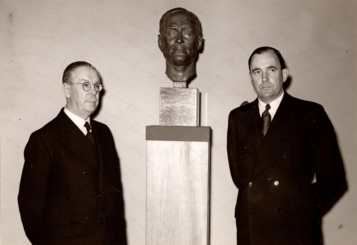 Tekniska museet, 30 maj 1942. Porträttbyst av Frans Wilhelm Lindqvist. Till vänsetr Generalkonsult Hugo Duhs, till höger Direktör Arne Hjort.