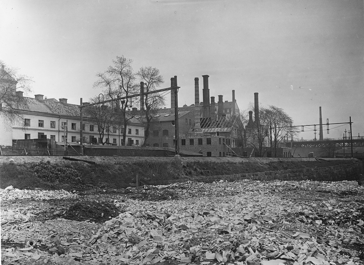 Rörstrands Porslinsfabriker. Foto från tippen. Rivning av fältspatugnarna pågår.