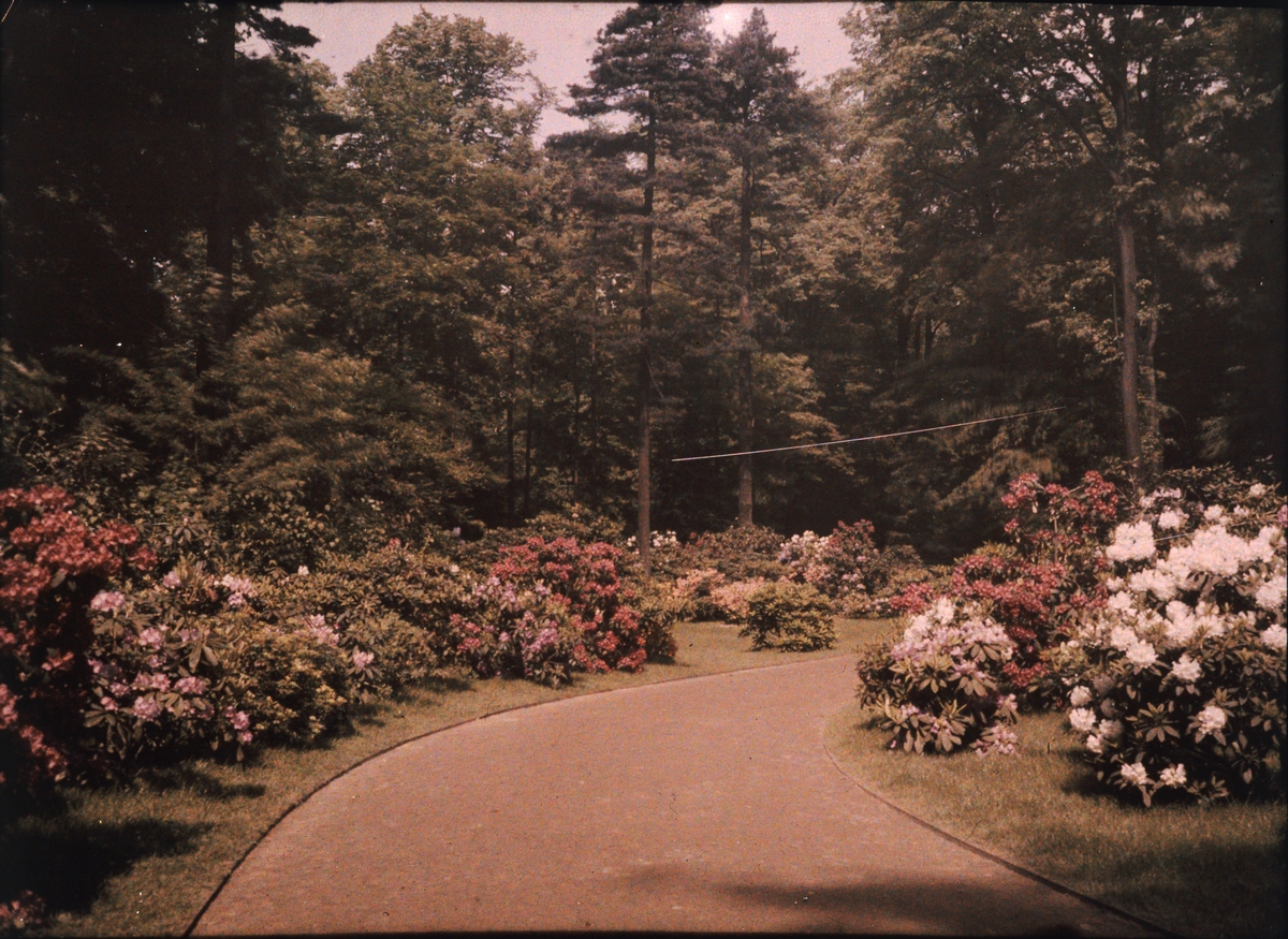 Lumières-autokrom. Stor trädgårdsodling av rododendron i Dresden. Fotograferad den 31 maj kl 1500 1910 med f/48, 90 sek. exponering.