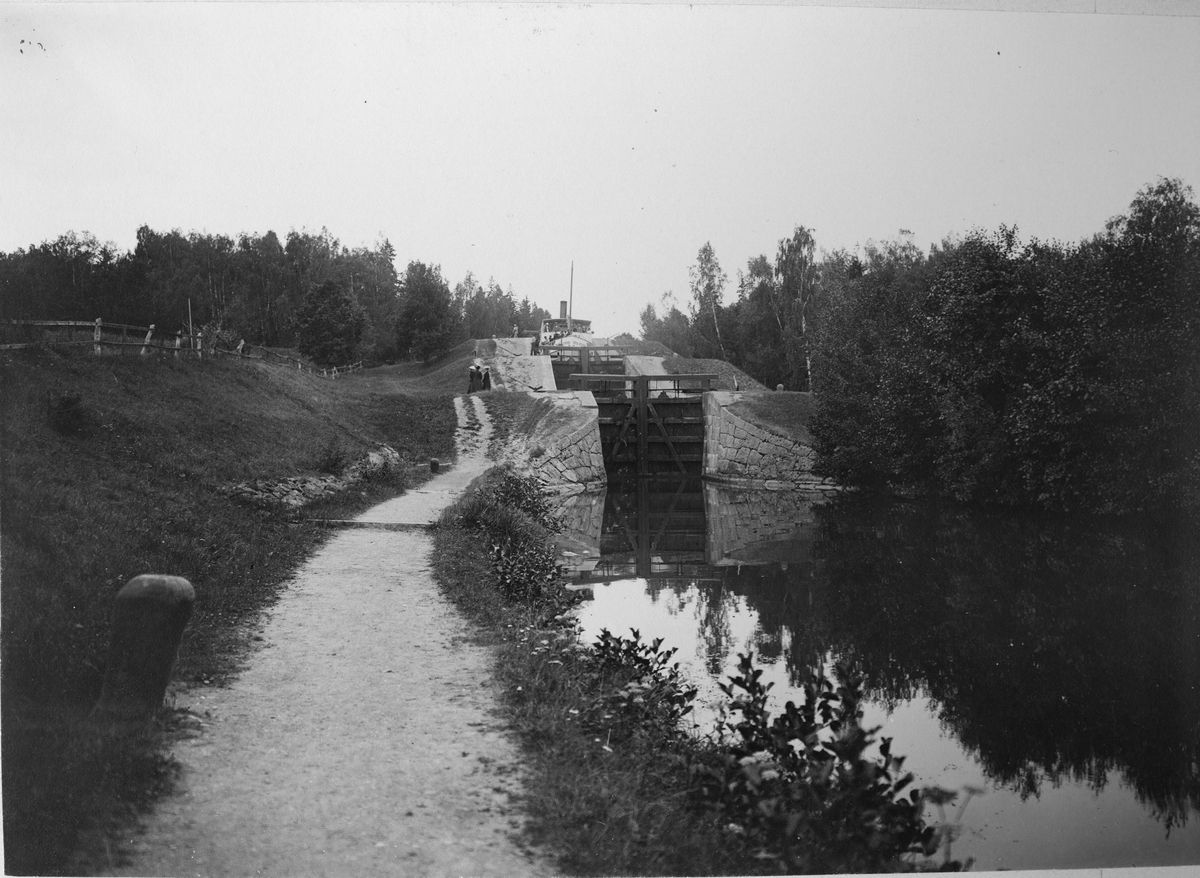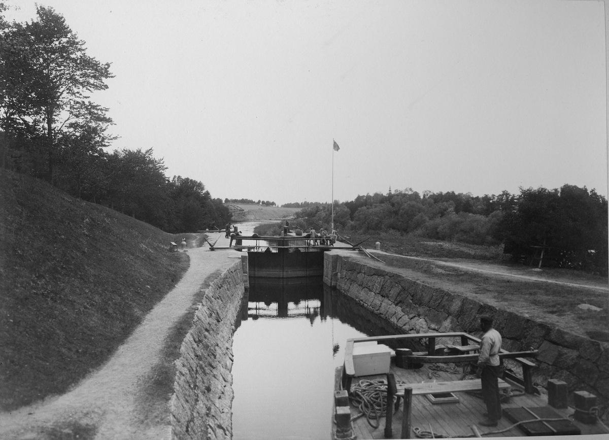 Kinda kanal Övre slussen vid Slattefors.Med fotografiet erhöll fotografen 5:e plats i Svenska Turistföreningens pristävlan 1902.