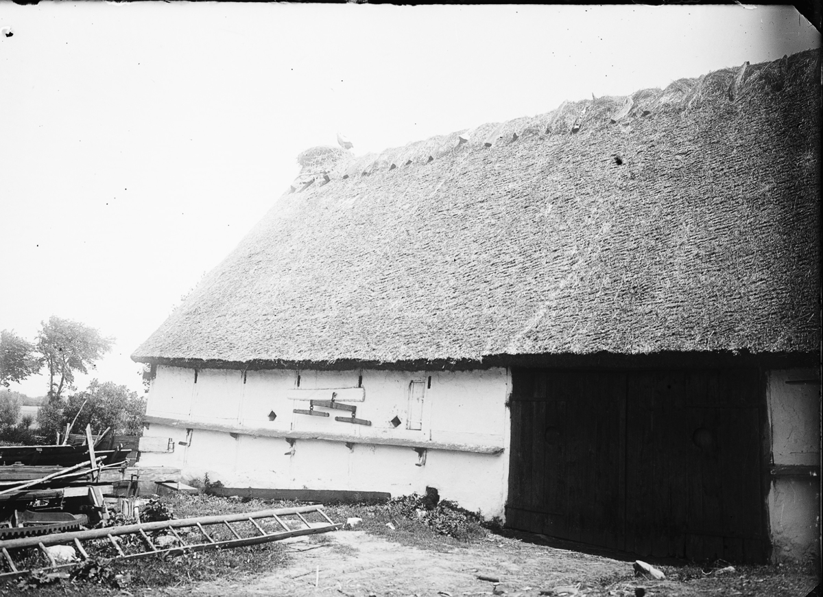 Gerda Johansson, Hjärtum 1893-10-15, med häst och åkervält, ögonblicksbild 25 maj 1907. Med på bilden finns också en hund och i bakgrunden syns den gamla ladugården och källarbyggnaden på Arnstorp.
